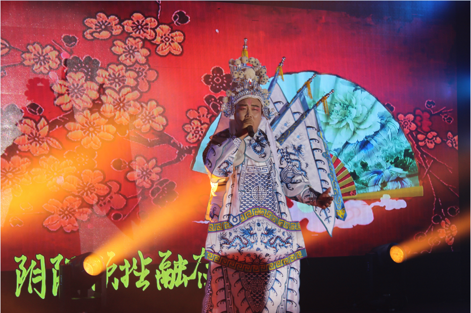 第二個(gè)節(jié)目是由牛懷賓帶來(lái)的《粉墨人生》,他身著戲袍,走著臺(tái)步,為偉大的信橋慶生。