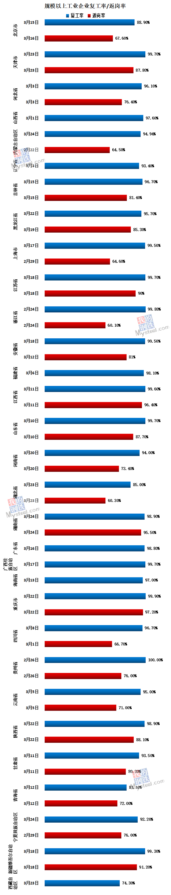 Second, from January to February, the growth rate of various investments at the demand side of construction machinery slowed down significantly. In terms of fixed investment, from January to February 2020, the national fixed asset investment (excluding farmers) was 333.23 billion yuan, down 24.5% year on year and 27.38% month on month. From January to February 2020, the national investment in real estate development was 101.15 billion yuan, down 16.3% year on year. From January to February, the housing construction area of real estate development enterprises was 6942.41 million square meters, up 2.9% year on year. From January to February, 103.7 million square meters of housing were newly built, down 44.9% year on year. Real estate development enterprises purchased 10.92 million square meters of land, down 29.3% year on year. From January to February 2020, infrastructure investment dropped 30.3% year on year. Among them, the mining industry dropped 3.8% year on year, the smallest drop in investment demand. The poor performance on the demand side is also reflected in the production and sales volume of all kinds of mechanical equipment. According to the industry statistics of China Construction Machinery Industry Association, 24 mainframe manufacturing enterprises included in the statistics from January to February 2020 sold 19,222 sets of various mining machinery products, up -37.0% year on year. Sales volume in the domestic market was 14,667 units, up -46.5% year on year. Export sales volume was 4555 units, up 48.2% year-on-year. According to the latest data from the National Bureau of Statistics, the output of excavators from January to February 2020 was 27,629 units, down 35.7% year on year. Third, the impact of the epidemic is gradually weakening and the traditional peak season is approaching. Mysteel statistics show that as of March 26, the return rate of industrial enterprises above the scale of 27 provinces and cities exceeded 90%, and the return rate of workers from Jiangsu, Jiangxi, Hunan, Chongqing, Xinjiang and other provinces exceeded 90%. Major projects have also started in various places.