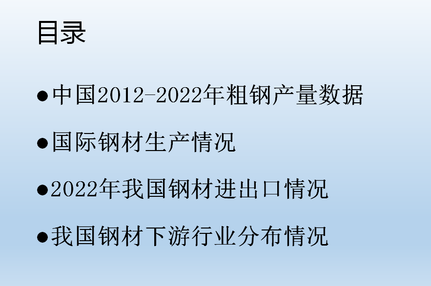•我國(guó)現(xiàn)階段已經(jīng)初步實(shí)現(xiàn)城鎮(zhèn)化的建設(shè),隨著房地產(chǎn)需求的下滑,我們普通鋼材很難有一個(gè)大的增量,但是我國(guó)的特殊鋼材還有很大的發(fā)展空間。結(jié)合國(guó)家鋼材發(fā)展現(xiàn)狀,我們也慢慢的理解公司制定“高端、國(guó)有、人無(wú)我有”政策的現(xiàn)實(shí)依據(jù),希望大家能出通過(guò)了解行業(yè)發(fā)展的方向,明確目標(biāo),開發(fā)客戶,更好的規(guī)劃自己的銷售,取得好的業(yè)績(jī)。